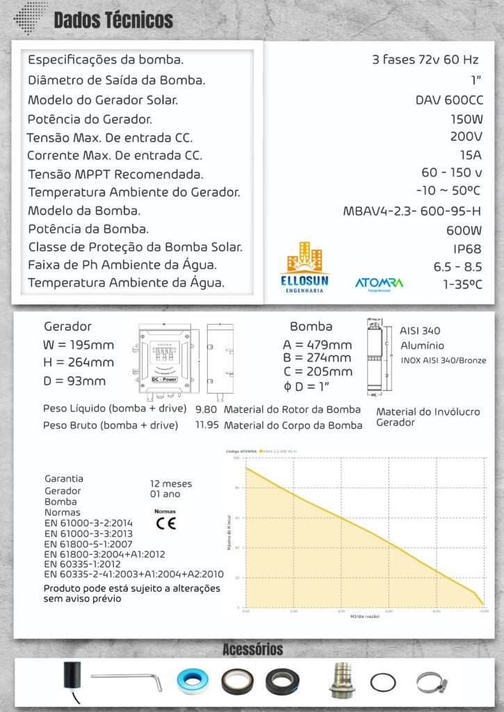 01 – Bomba Submersa 01 – Gerador Solar e Acessórios 01 – Arranjo Solar (de acordo com o modelo) 01 – Manual de Instalação