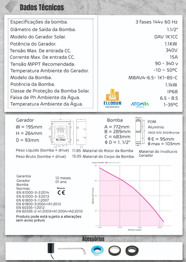01 – Bomba Submersa 01 – Gerador Solar e Acessórios 01 – Arranjo Solar (de acordo com o modelo) 01 – Manual de Instalação